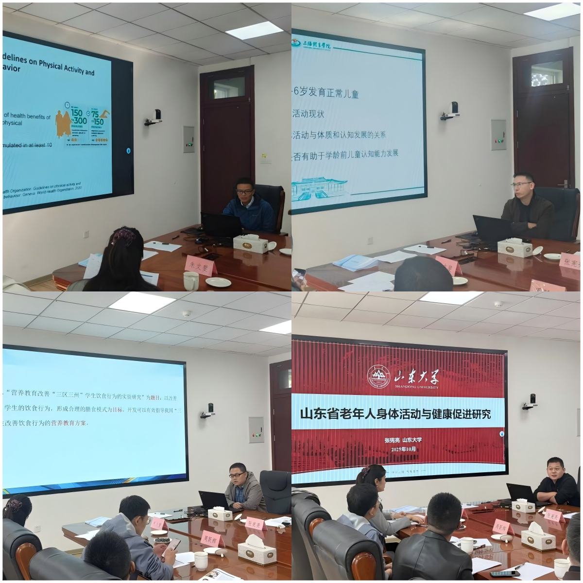 最后张宪亮副教授作了题为“山东省老年人身体活动与健康促进研究”的报告,详细介绍了山东大学运动与健康研究团队近期研究成果,以及目前开展的课题研究项目。受邀专家对于团队未来发展提出了诸多宝贵意见,并探讨了下一步建立全国性身体活动调查队列的可能性和可行性,提出了构建身体活动与老年健康促进学术共同体的愿景。