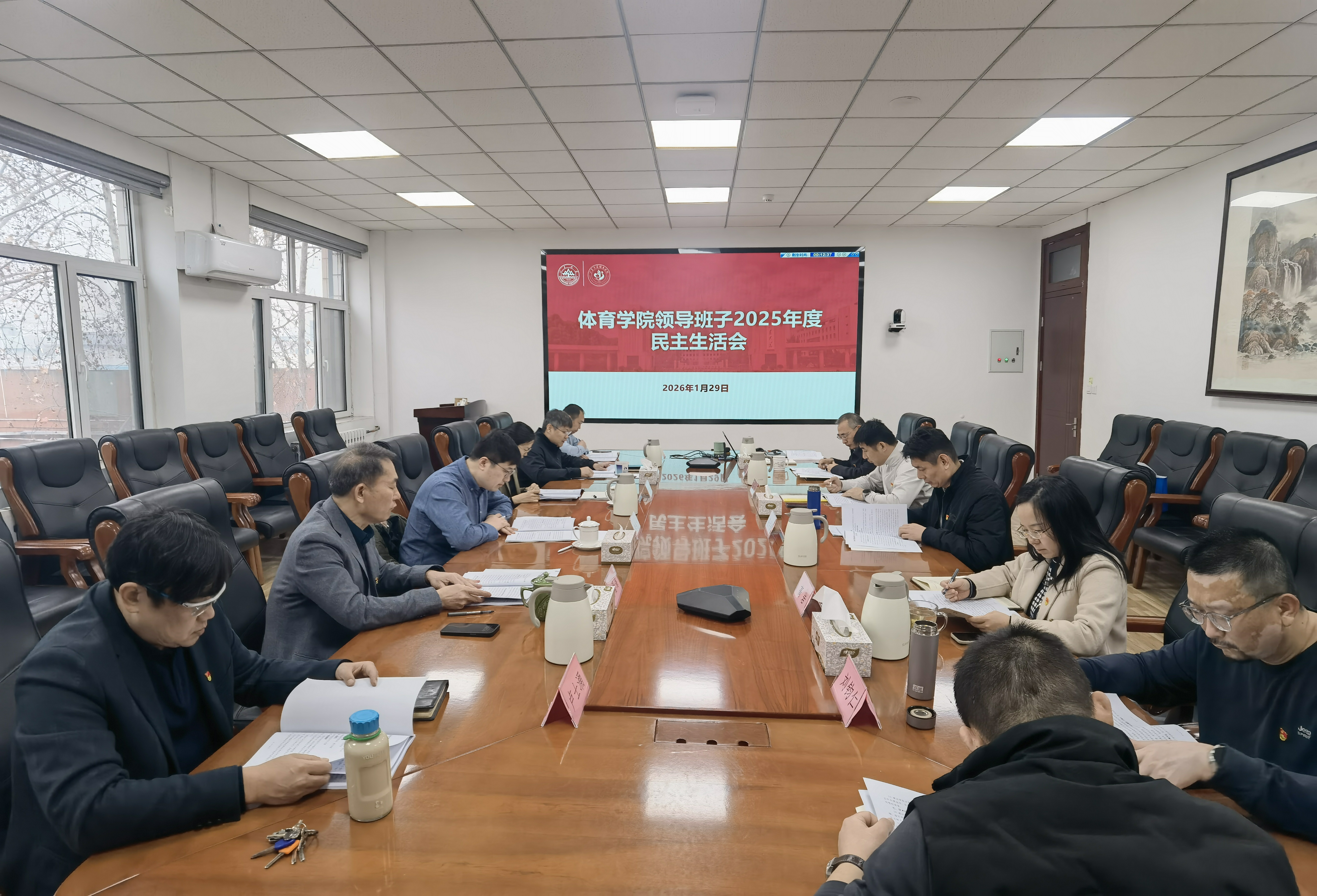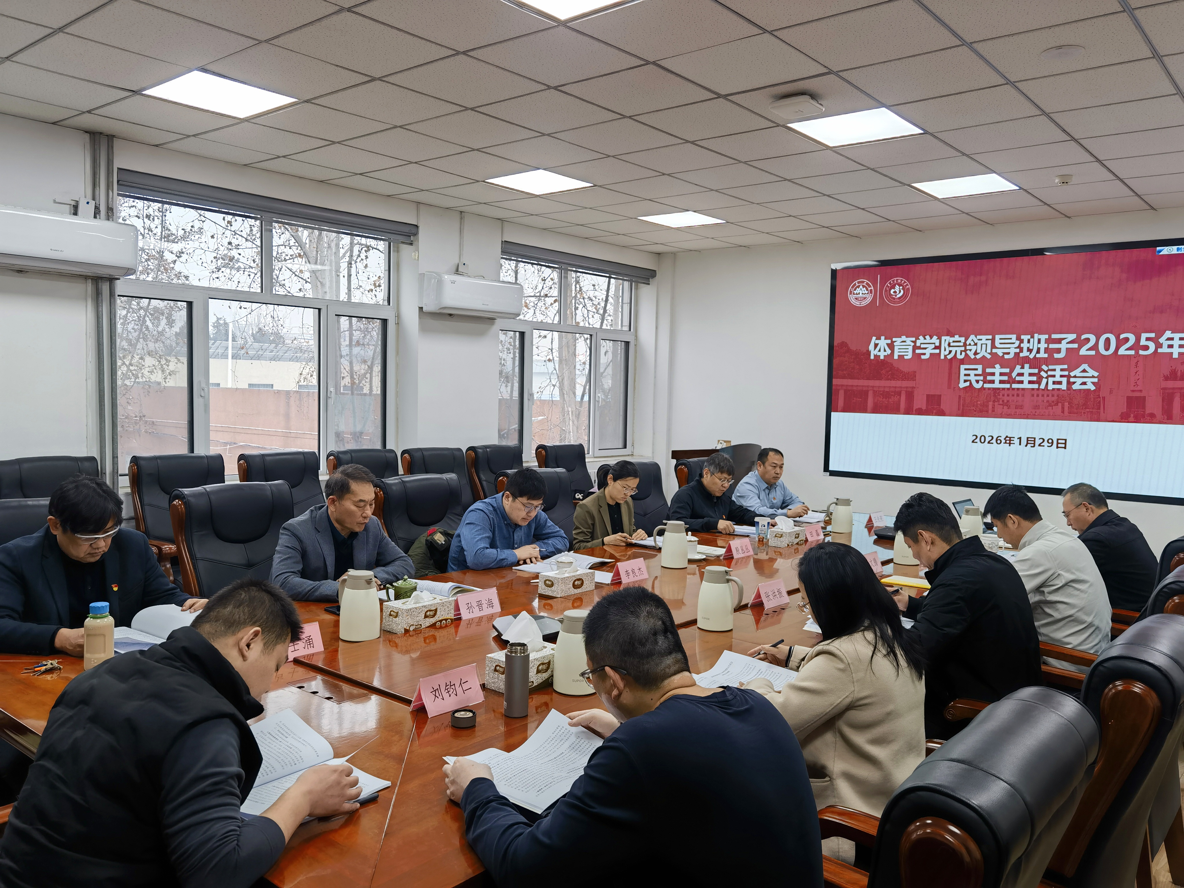 1月29日上午,体育学院领导班子2025年度民主生活会在千佛山校区召开。学校党建第四考核组副组长李良杰、组员殷丛丛到会指导。会议由体育学院党委书记田磊主持。